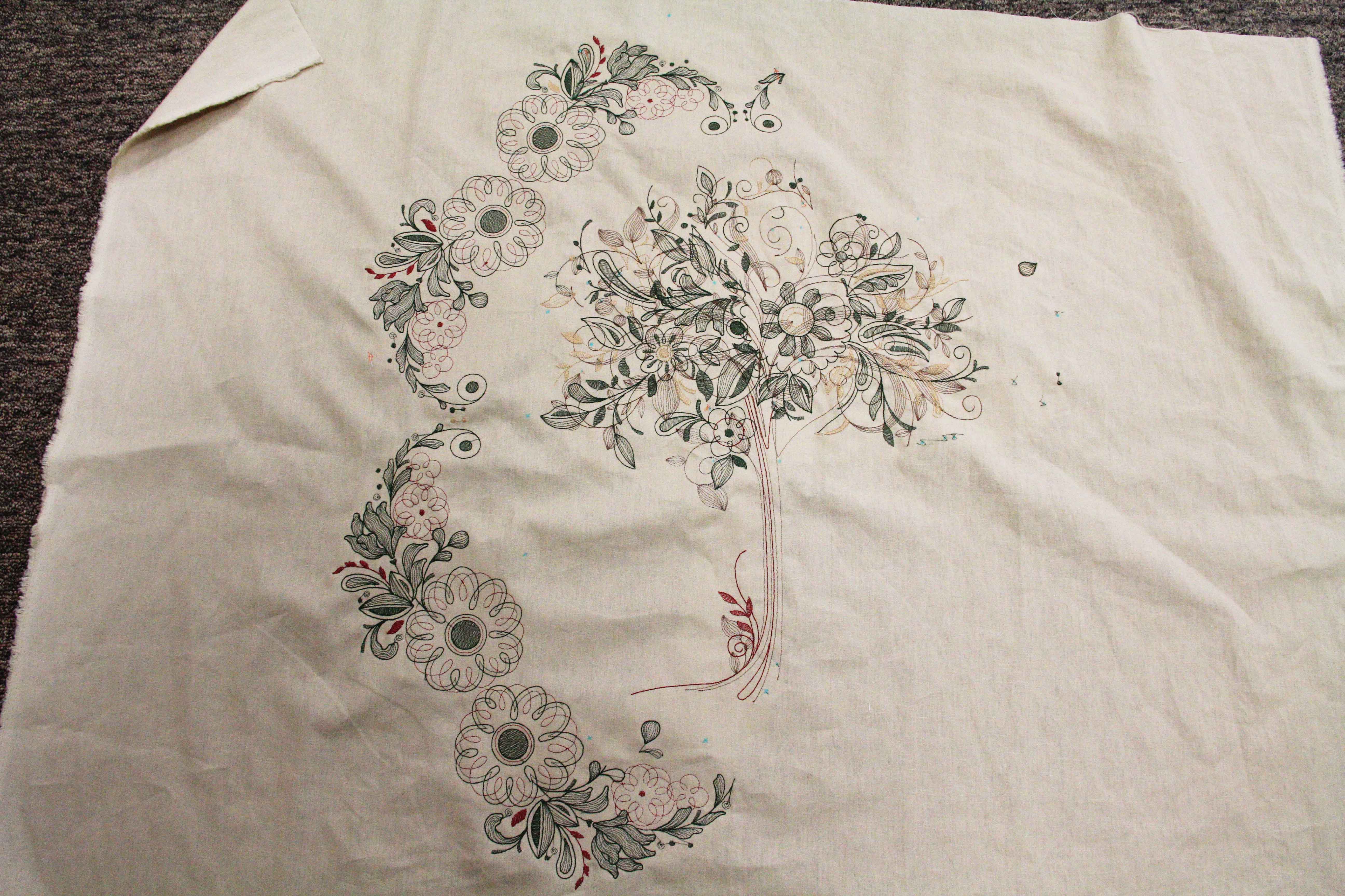 Remember, its about a 2 ft. x 2 1/2 ft. design when completed. It hasn’t been pressed in about 3 hoopings. But I think I can make it work. What a learning opportunity this has been!