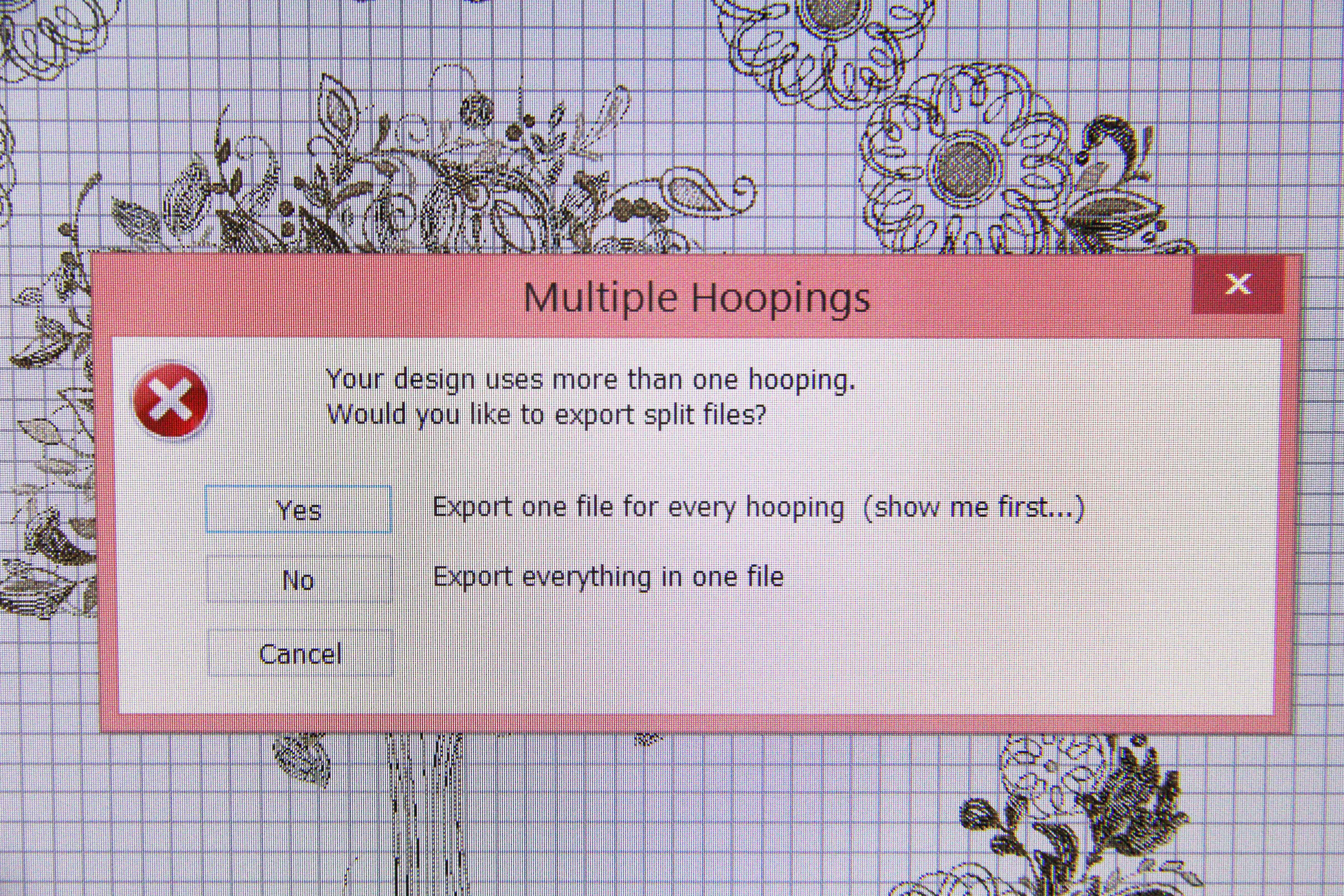 I used the hoop canvas in Embroidery Software 7. When I went to save, it asked me this question: Would you like the export to split the files-one file for every hooping–SHOW ME first.