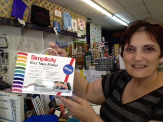 This is a large shop that also sells Janome machines. I had picked up my mom prior to this shop and she found some lovely fall fabric to make a handbag. Everyone was very helpful. Their shop hop basket is not a basket at all. I thought this was rather brilliant. Their raffle item is a bias tape maker from Simplicity. They also have someone who sharpens scissors and travels to area Joann’s Fabrics to sharpen scissors, including the one in Geneva Commons.