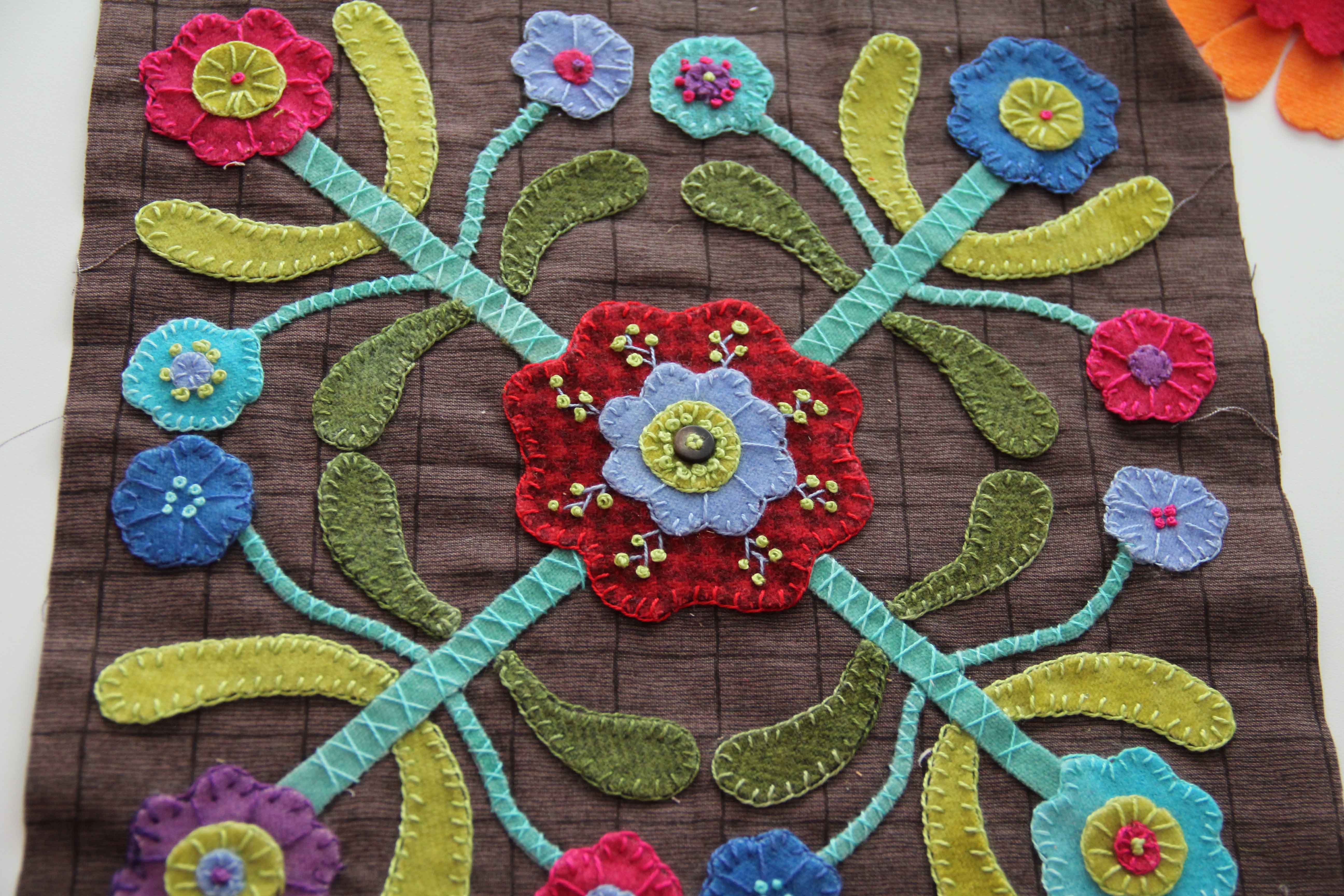 The aquas, golds and greens in this pattern were a fun interpretation of the same floral design. Valdani cotton is my preferred thread for hand work. I have purchased directly from them, but you can find local shops who carry it. If your quilt shop doesn’t, be sure to ask them to start carrying it. You are likely not the only one who would like to see it.